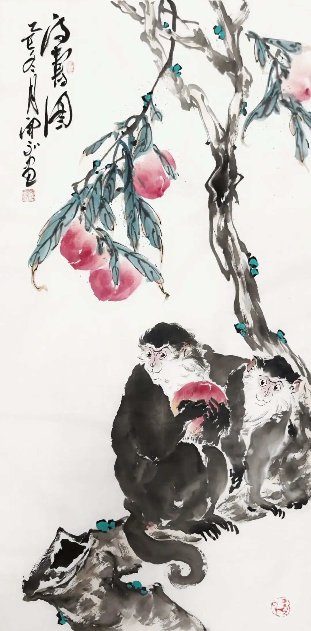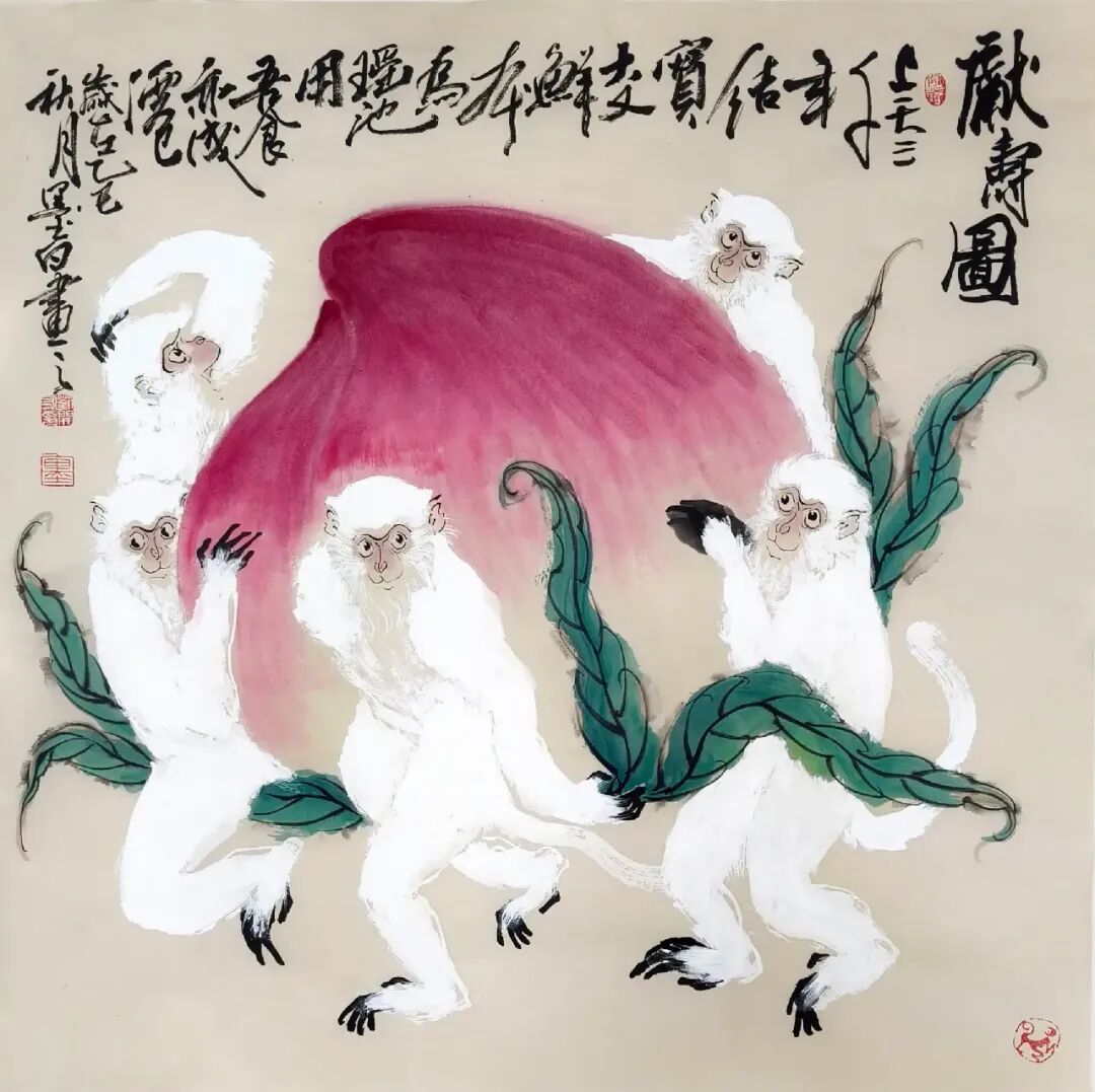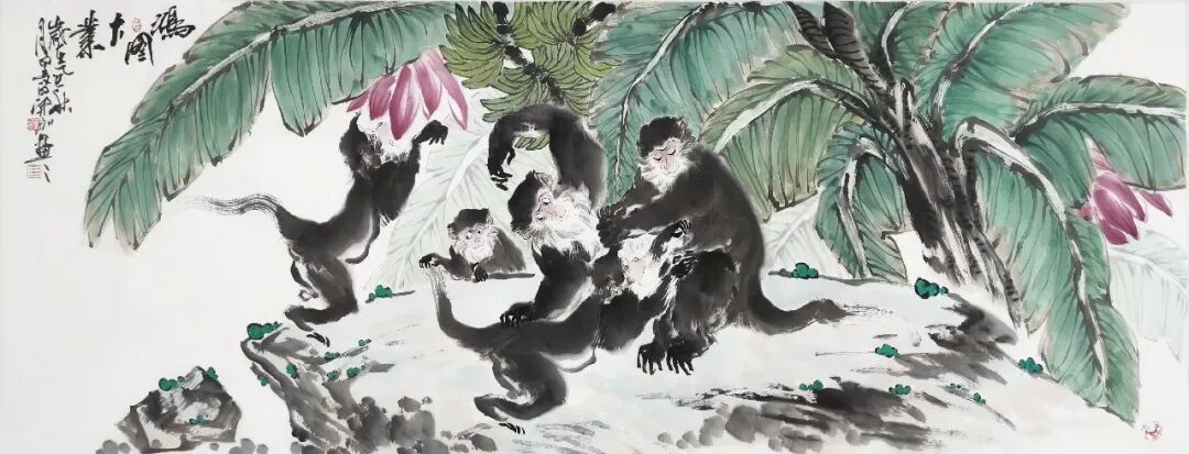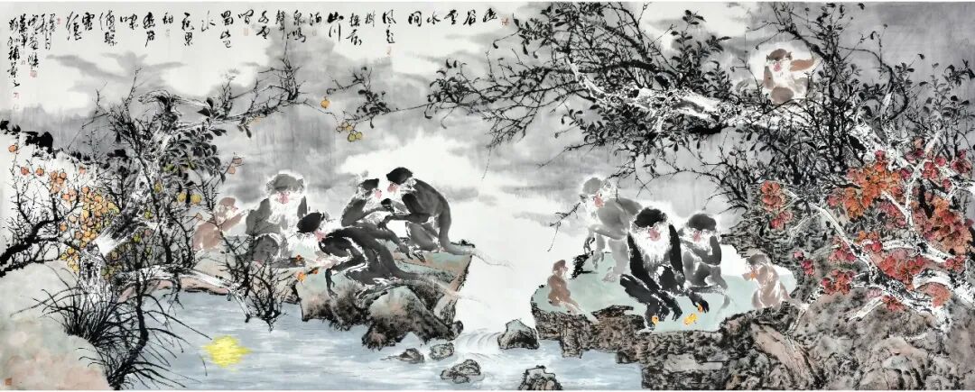 二技法创新,融合写意与工笔之长,形成“简繁相生”的独特风格。例如,在《灵猴听经》中,他以工笔技法刻画猴子的毛发,以写意笔触渲染石壁的苍劲斑斓,使画面既有细节的精致,又有整体的气韵。