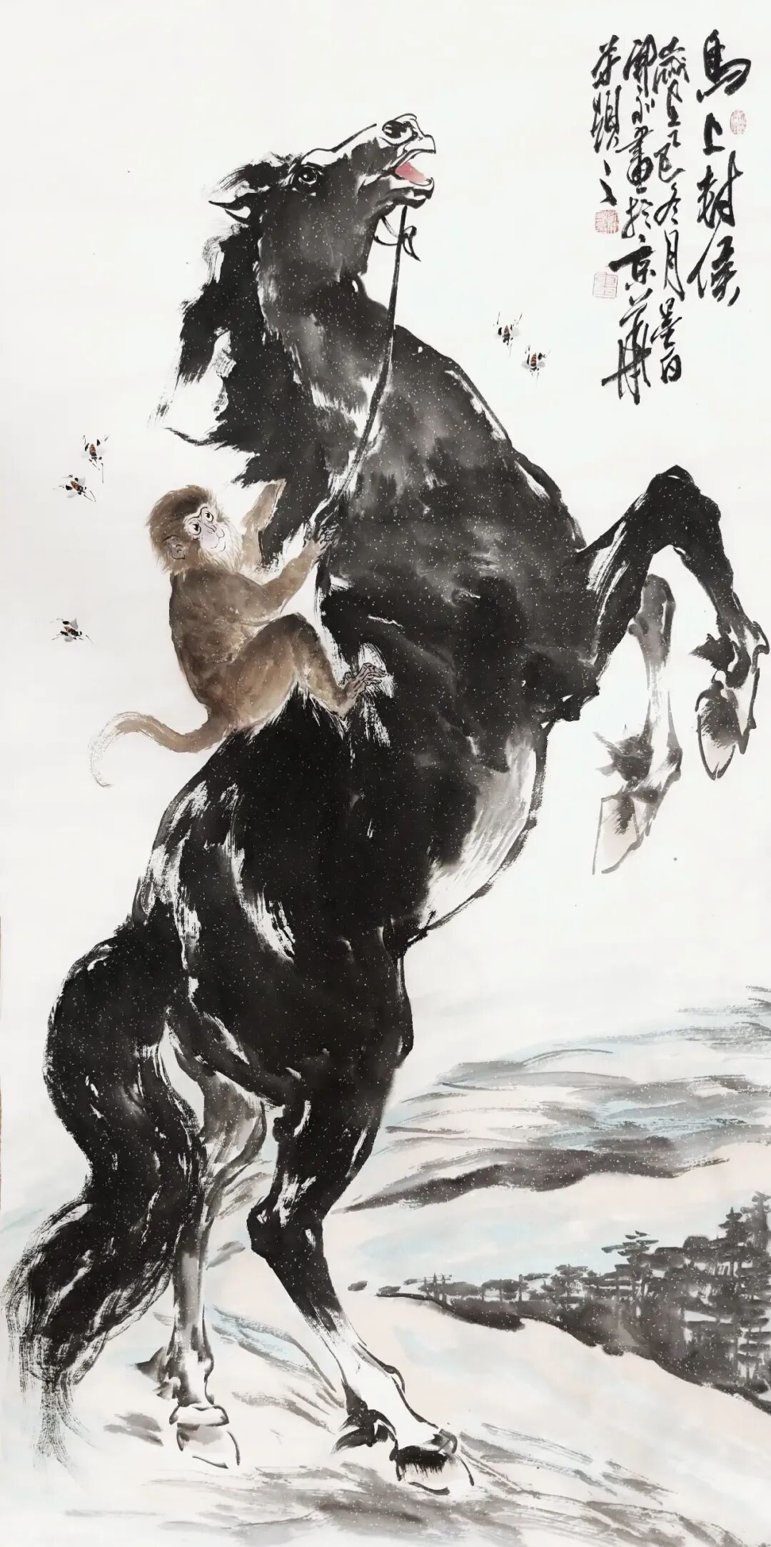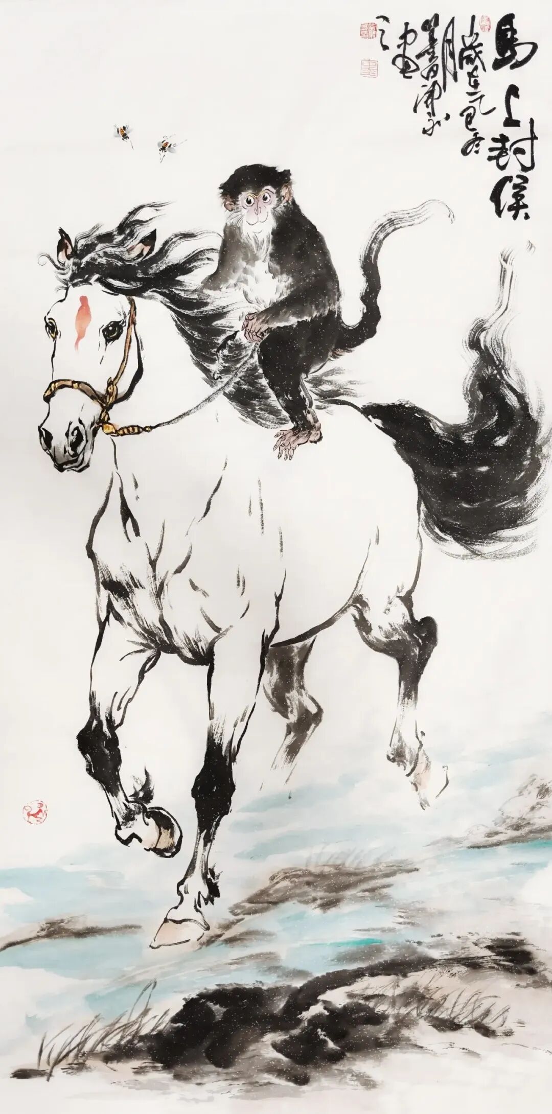 同时,刘开永的创作也深受传统文化影响。他通过谐音“封侯”等手法,将猴子的形象与仕途通达、好运将至的传统吉祥观念相结合,赋予作品文化内涵。在《封侯图》中,他以猴子骑马的造型,既保留了水墨的写意性,又通过细节的刻画增强了画面的真实感,使作品成为传统与现代的对话。