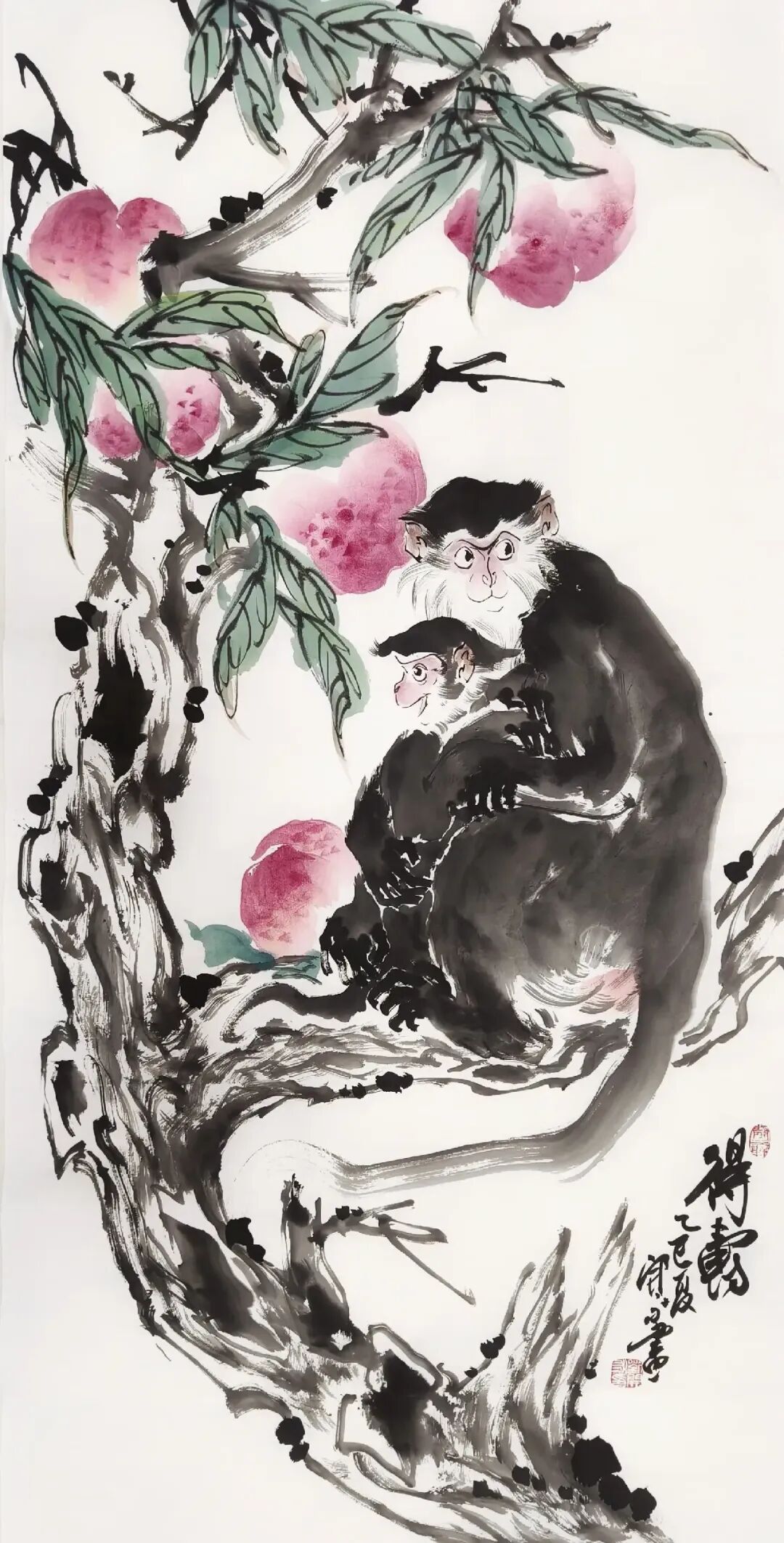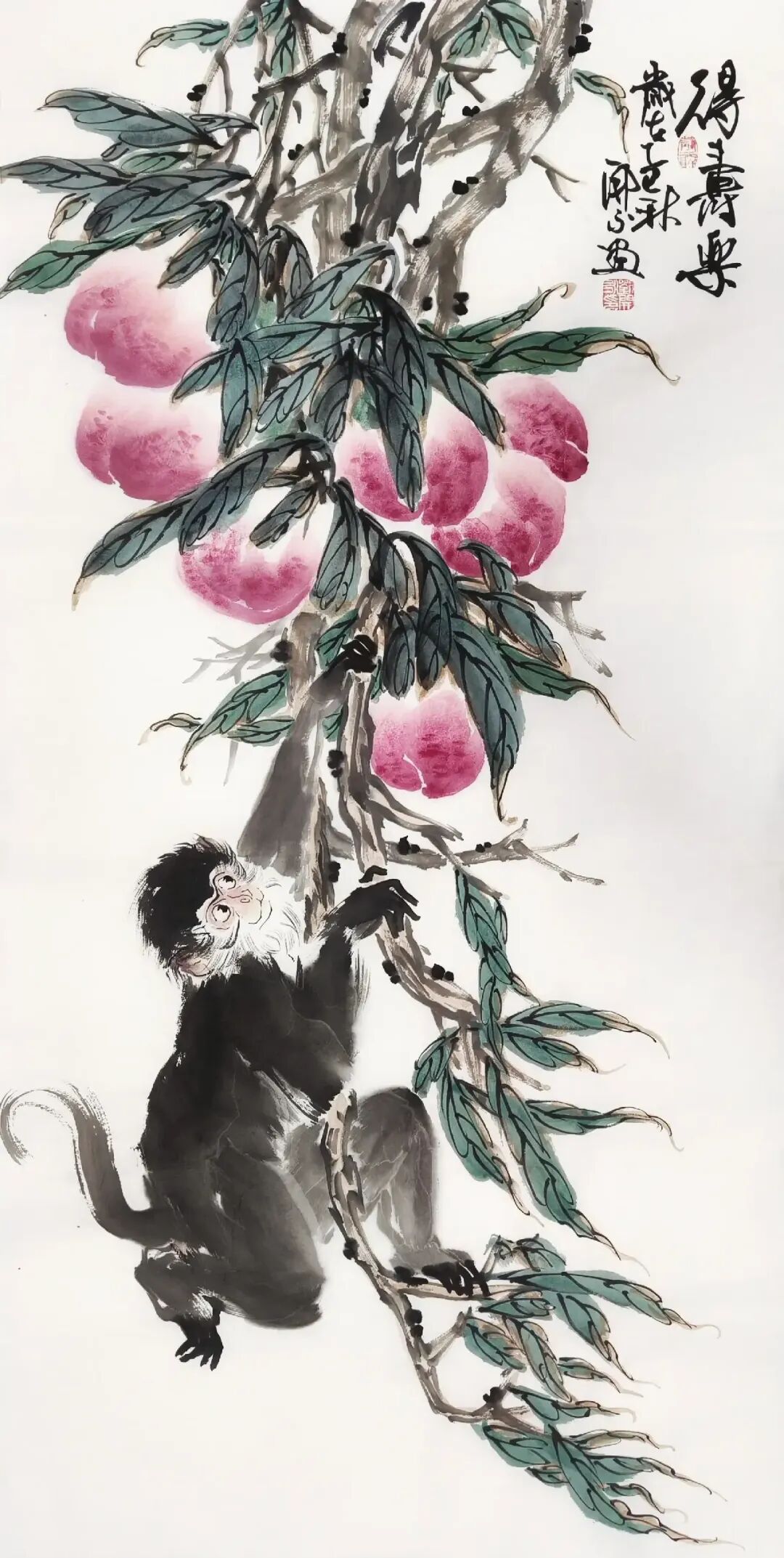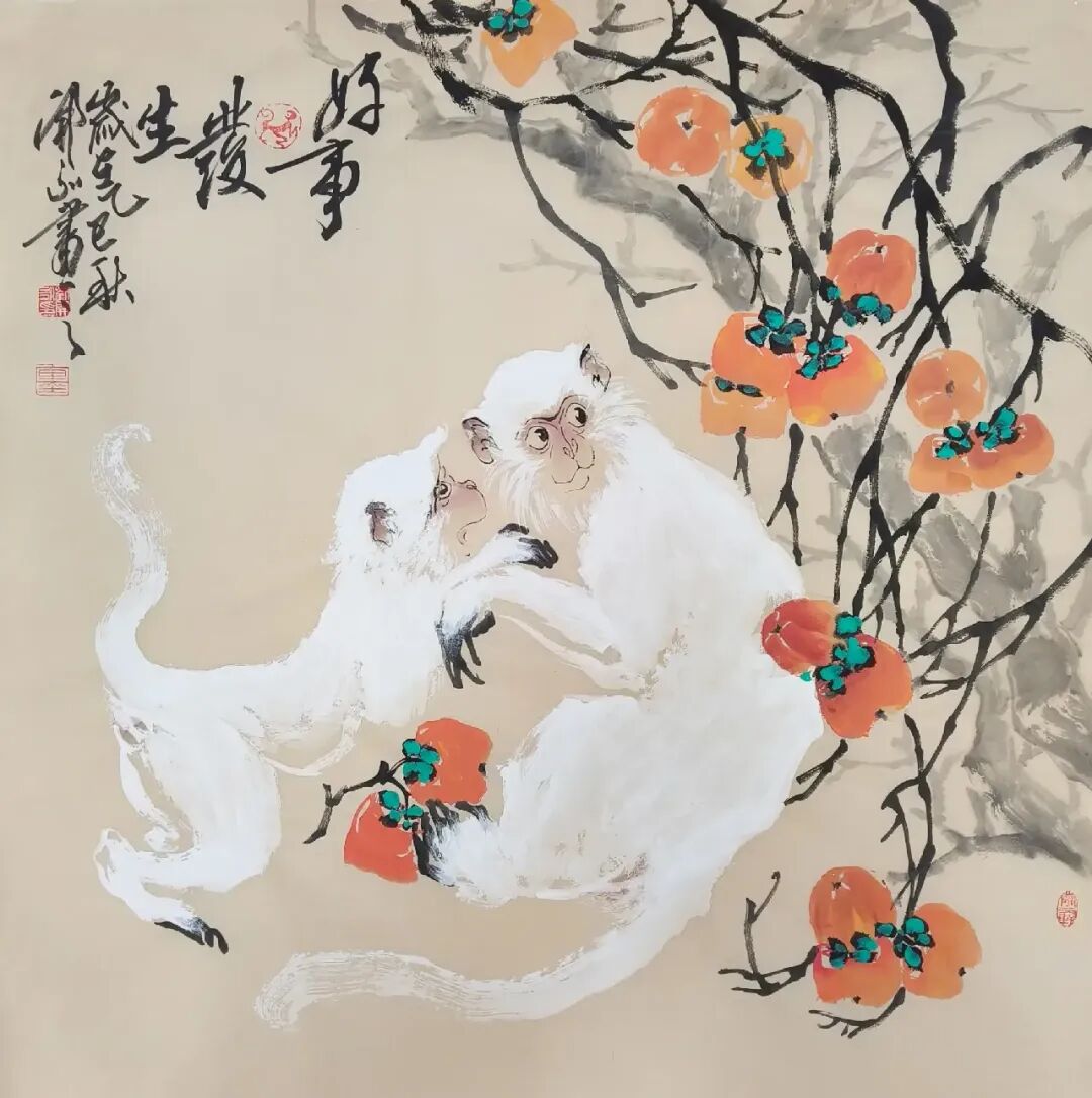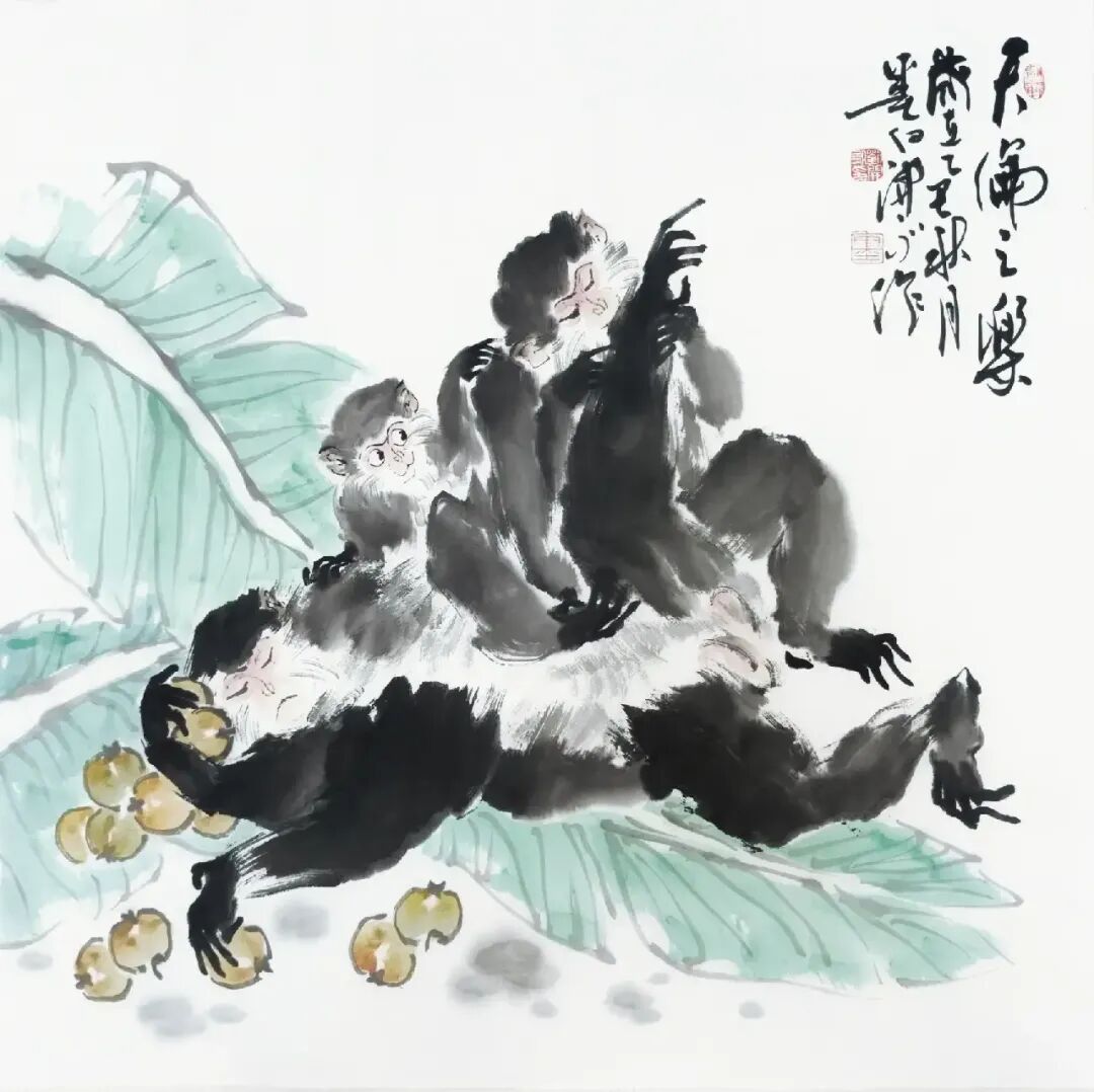 刘开永的猴画创作源于对自然与人文的双重观察。他长期写生深入山林,观察猴子的生活习性,捕捉其瞬间的动态与神态。这种“师法自然”的创作理念,使其作品超越了单纯的动物描绘,升华为对生命与自然的礼赞。例如,在《观秋图》中,他以简练的笔触勾勒出猴子攀枝摘果的姿态,背景辅以淡墨渲染的秋林,既突显了猴子的活泼,又营造出秋意盎然的意境,使观者如置身山林,感受自然之趣。