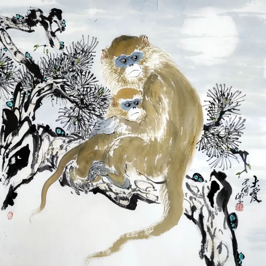 刘开永的猴画艺术在继承传统的基础上,实现了三个维度的创新:一题材创新,将猴子从单纯的吉祥符号转化为具有人文深度的艺术载体。其作品不仅表现猴子的活泼与机灵,更通过母猴舐犊、孤猴独处等场景,探讨生命、亲情与孤独等永恒主题。