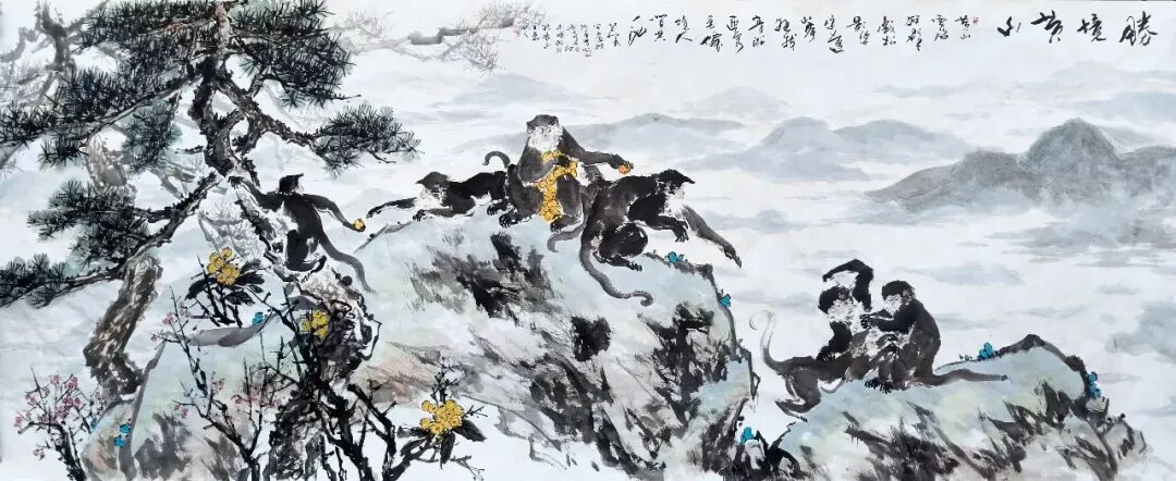 三意境创新,通过山水与猴子的结合,构建“自然与生命共生”的意境。在《胜境黄山》中,猴子攀援于巨石飞瀑旁,背景以泼墨技法渲染出山水的苍茫,使观者感受到自然的壮美与生命的脆弱,引发对生态保护的思考。